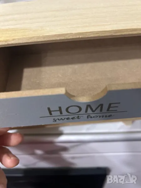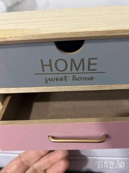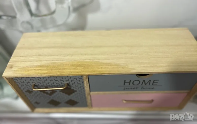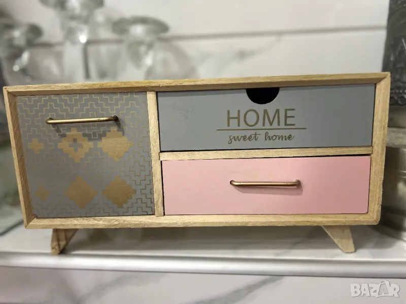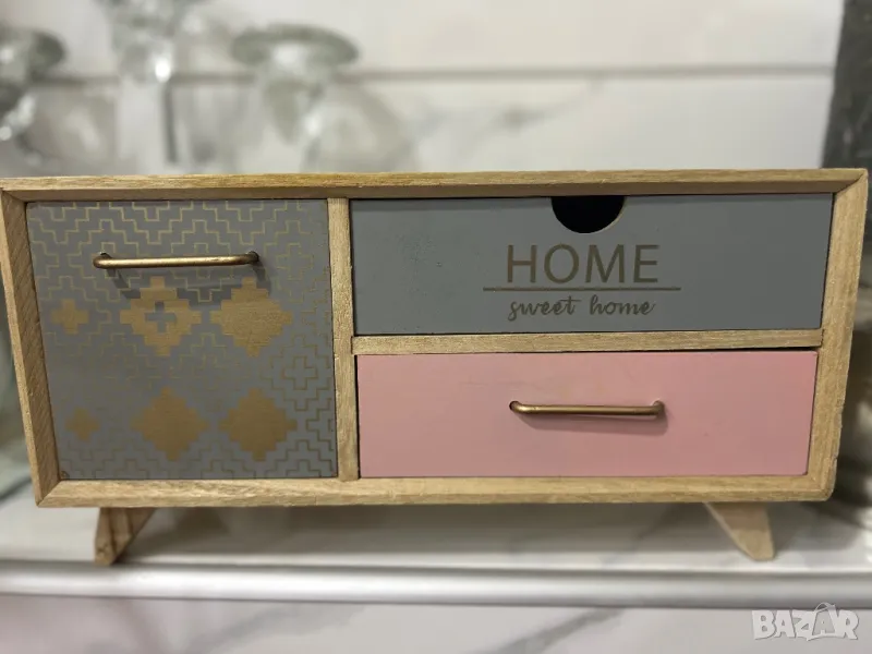 Декоративна дървена кутия с крака и 3 чекмеджета с послание и златни дръжки.