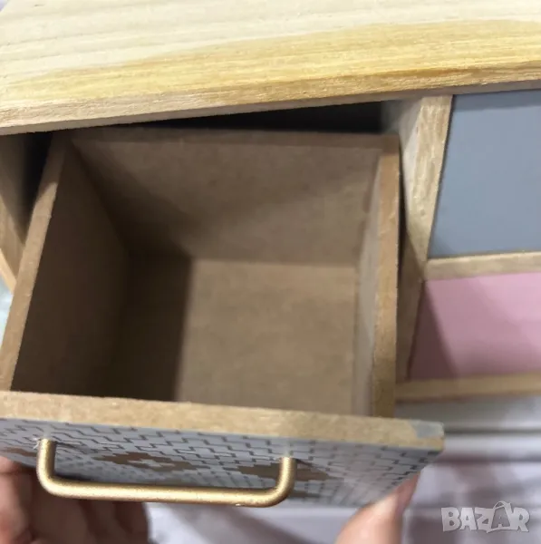 Чекмеджетата са с размери 14.5x8x cm и 8x8.5x6.5cm.