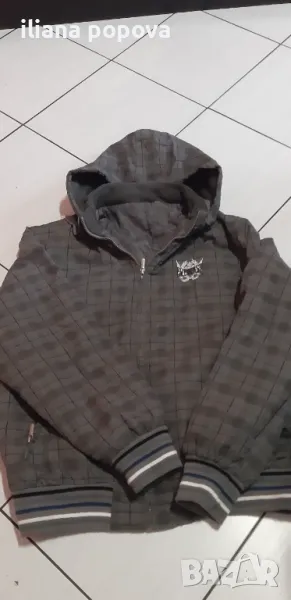 Якето е в много добро състояние.Цвят сиво и черно.Закупено в Англия.Размер на етикета L .Дължина на ръкава - 66 см. гръдна обиколка 120 см. дължина - 68 см. Якето разполага с два джоба с цип , качулка с полар.Якето има лек пълнеж между плата и хастара.Подходящ сезон за ползване - пролет и есен.