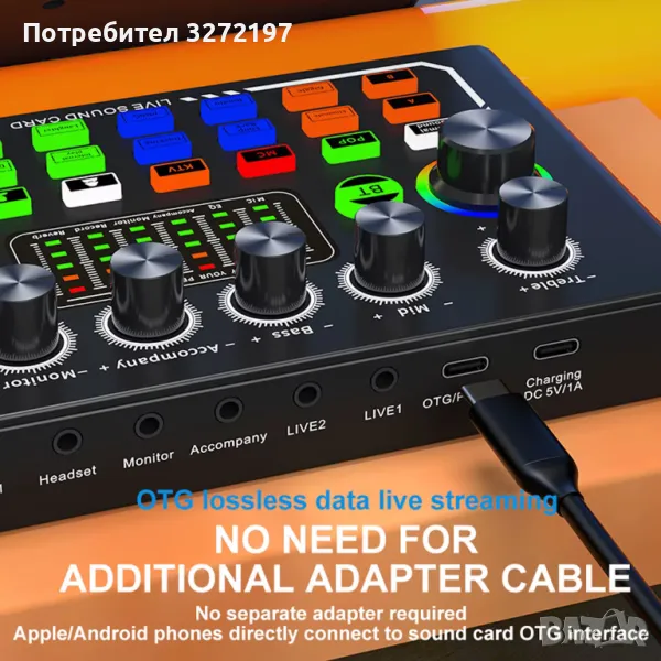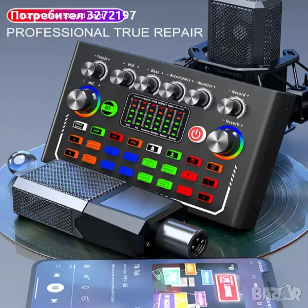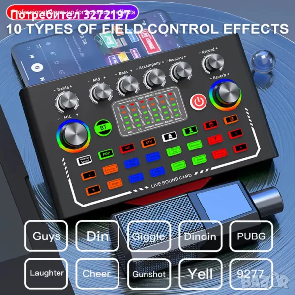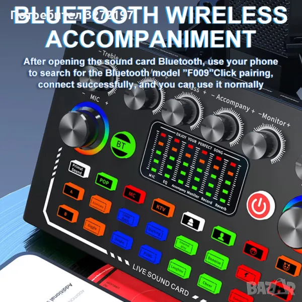 Това е най-новата F009 звукова карта на живо, с внесен двоен DSP чип, безжичен Bluetooth съпровод, прецизна настройка с двоен двигател, усъвършенствано интелигентно управление на светлината. Светлините на конзолата, които бият според музиката, ще направят концерта ви пълен с вълнение.