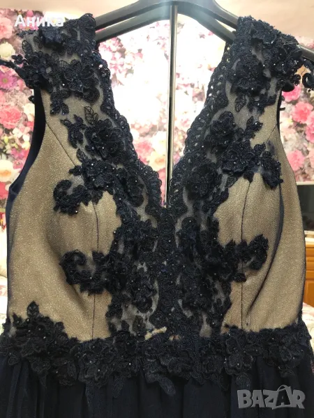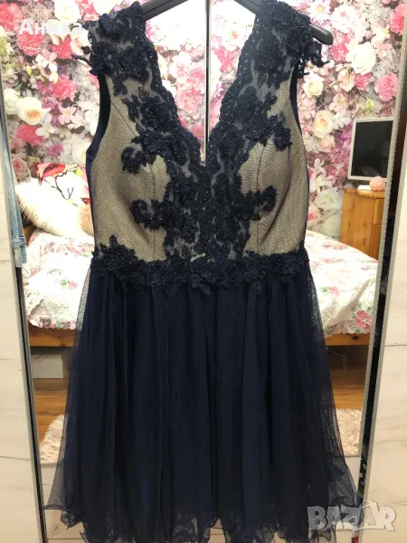 Официална рокля с дантела в син цвят. Обличана веднъж за повод без следи от употреба. Размерът е Л.
