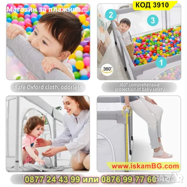 Със своя компактен дизайн и лесен монтаж, нашата голяма кошара за игра е перфектна за използване в домашни условия или на път. Можете да я поставите във всяка стая на вашия дом или да я вземете със себе си при пътуванията си. Тя е лесна за пренасяне и съхранение, без да заема много място.