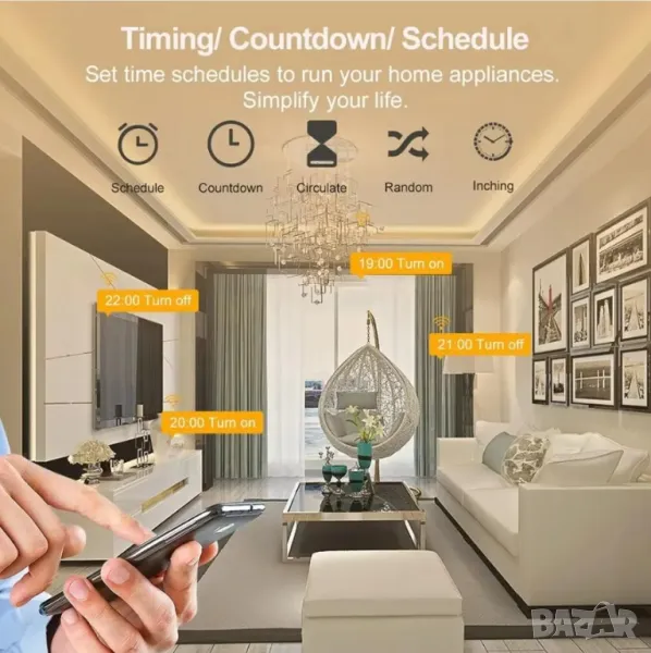 Дава възможност за ръчно или програмирано комутиране на всевъзможни електроуреди и устройства. Уреда се включва директно в контакта и се свързва безжично с Вашият рутер, което позволява отдалечен контрол на електроуредите с приложението "eWeLink" от Вашия смартфон: включване/изключване, както и седмичен (месечен, годишен) таймер - програматор с отделните дни от седмицата.