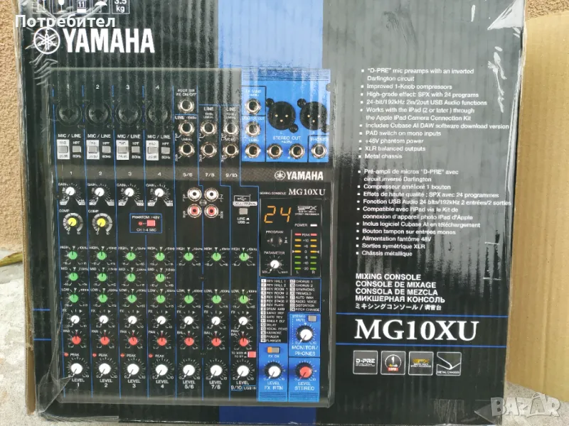 Здравейте.Продавам смесител производство Малайзия а не Китай. Yamaha MG10XU 10 канален миксер на живо с FX и USB интерфейс. 10-каналната миксираща конзола Yamaha MG10XU : Макс. 4 микрофона / 10 линейни входа (4 моно + 3 стерео) / 1 стерео шина / 1 AUX (вкл. FX) MG10XU се предлага с 24-битови / 192kHz 2in / 2out USB аудио функции работи с iPad (2 или по-нов) чрез комплектът за свързване на камера на Apple iPad включва версия за изтегляне на софтуер Cubase AI DAW.