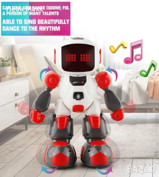 Роботът разполага с бутон на гърдите, който му позволява да записва звук с продължителност до 30 секунди, който след това да повтаря докато ходи.