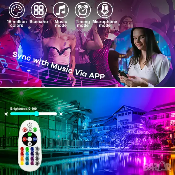 Направи си сам 16 милиона цвята, сценариен режим, музикален режим (първо изтеглете музика на мобилния си телефон), синхронизирайте промените в цветовете в музика. Режим на микрофона, димируема светлина, функция за памет, групово управление, времева функция.