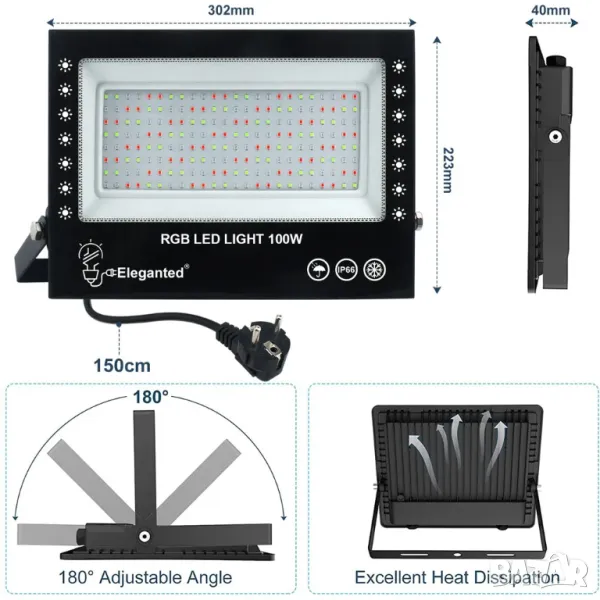 Висококачествен корпус от лят алуминий и ефективният дизайн на охлаждането го правят по-издръжлив и надежден, достатъчно, за да издържи на суровата среда. IP66 водоустойчиви RGB прожектори, идеални за осветяване на интериори, външни фасади, градини, дворове, балкони, партита и много др. Елегантния RGB LED прожектор е регулируем на 180°. Може да се използва в среда от -20°C до 45°C и може да издържи на тежки метеорологични условия като силен дъжд, суграшица или сняг.