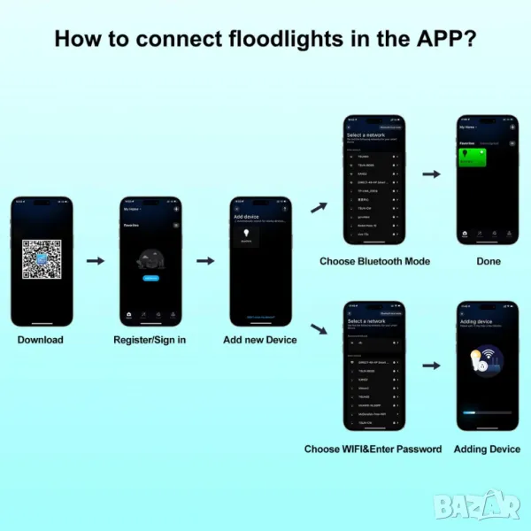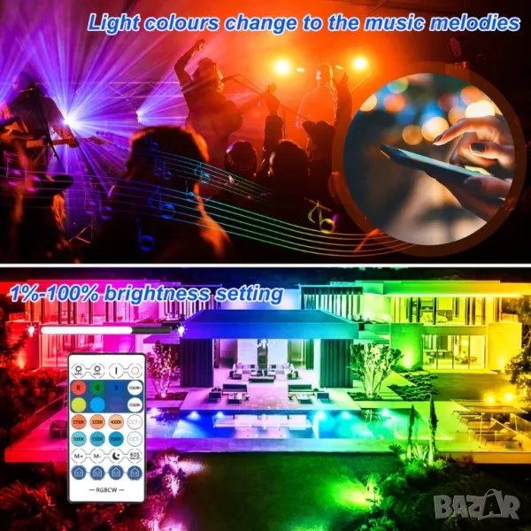 Използва най-новата Bluetooth мрежова технология, интелигентния RGB прожектор поддържа функцията за групово управление, можете лесно да управлявате един или повече RGB интелигентни LED прожектори от приложението. Можете да изберете всякакви цветове и режими, за да създадете различни атмосфери според вашите предпочитания.