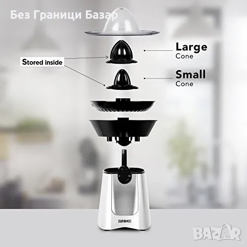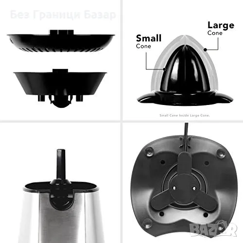 Две сменяеми конуси за различни размери плодове – лимони, портокали, грейпфрути.