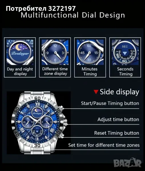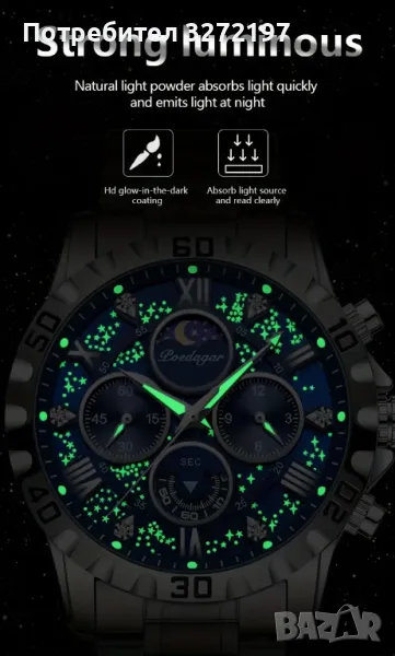 POEDAGAR луксозен часовник,кварц,неръждаема стомана,водоустойчив светещ,хронограф,дата,сапфир