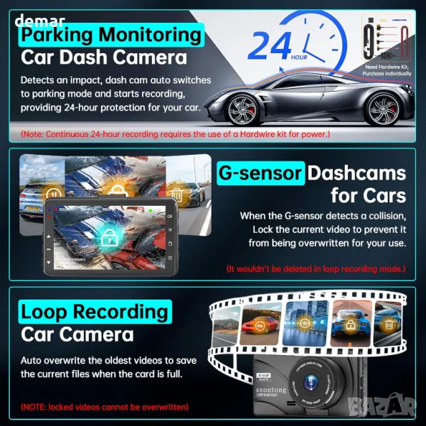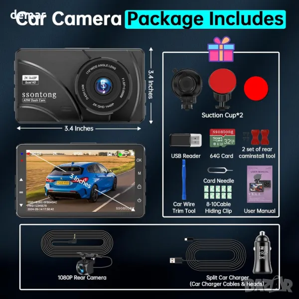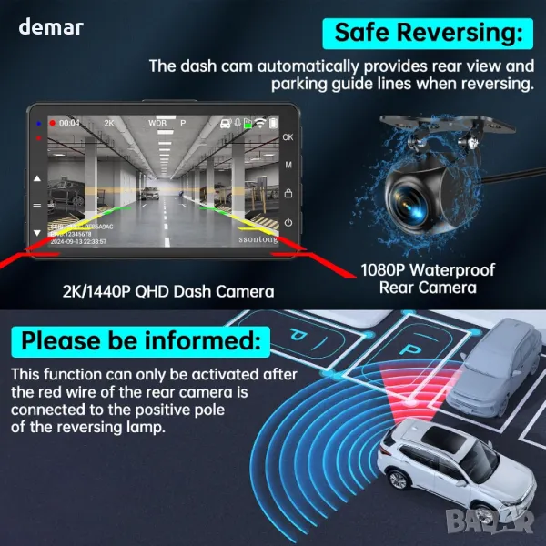 Тази двойна камера предлага 2K QHD преден и 1080P заден запис с широкоъгълни лещи за детайлни кадри, дори при слаба светлина, благодарение на усъвършенстваната WDR и технология за нощно виждане. Управляван чрез придружаващото приложение за Android или iOS, той позволява стрийминг на живо, изтегляне на видео и лесно споделяне в социални медии. Функциите включват безпроблемно циклично записване, G-сензор за автоматично заключване на видео при сблъсък и 24-часов режим на паркиране със запис с изтичане на времето (необходим е комплект кабели). Неговото подобрено зарядно устройство поддържа опции за USB-C и запалка, с допълнителен USB порт за зареждане на други устройства. Водоустойчивата задна камера осигурява 140° широкоъгълен изглед, подпомагайки движението на заден ход и елиминирайки слепите зони. Предназначена за автомобили, камиони и SUV, тази видеокамера осигурява сигурност, събиране на доказателства и удобна употреба. Wi-Fi работи в рамките на 3-5 метра за безпроблемна връзка.