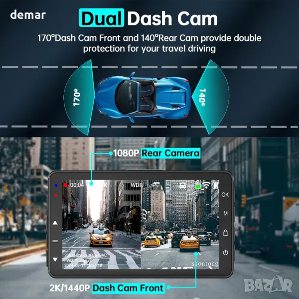 Dash Cam отпред и отзад, 2K, WiFi/БЕЗПЛАТНО ПРИЛОЖЕНИЕ, отпред 170°+140° отзад