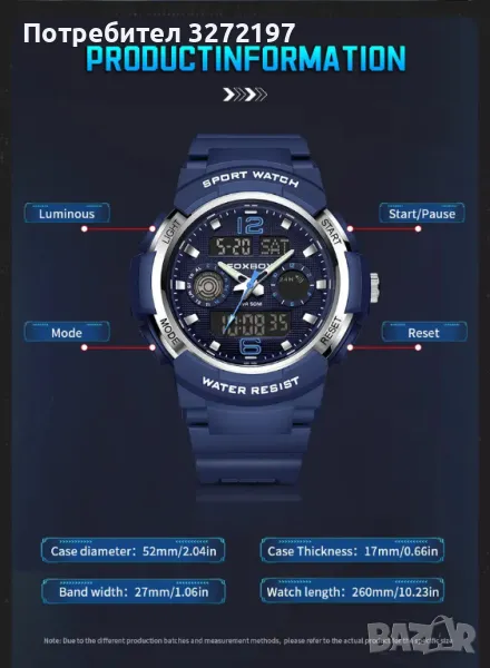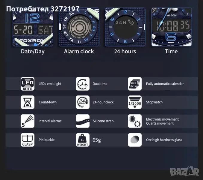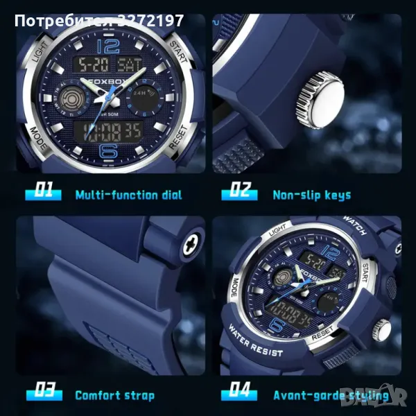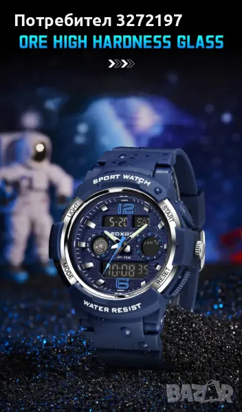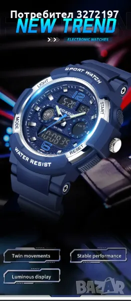 водоустойчив, LED дисплей, подсветка, удароустойчив, хронометър.