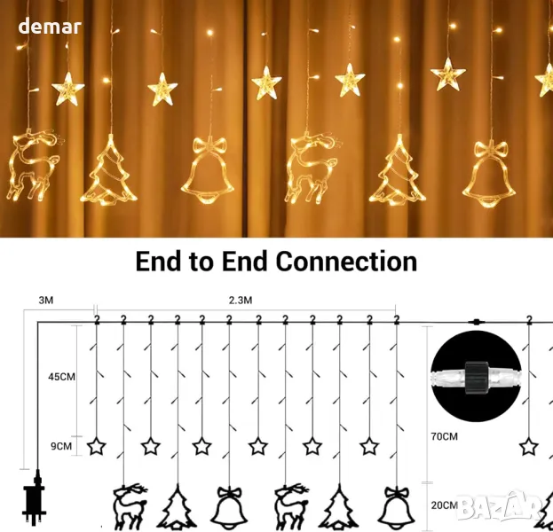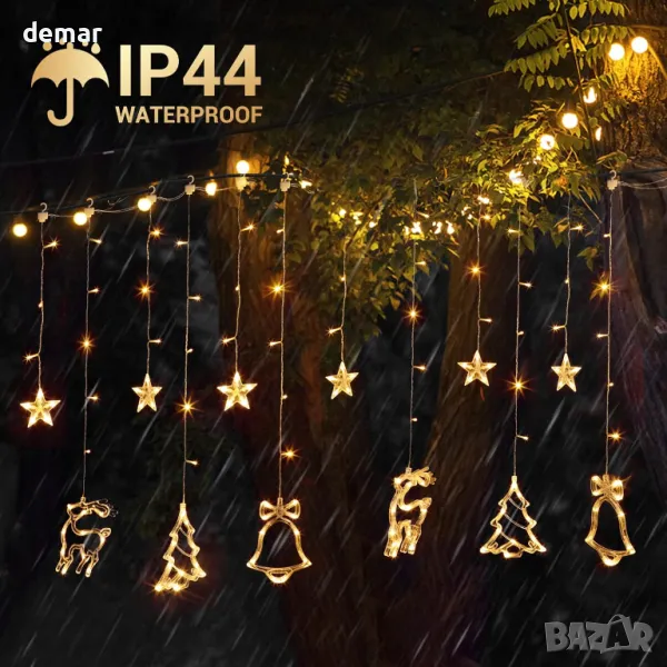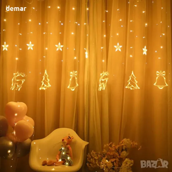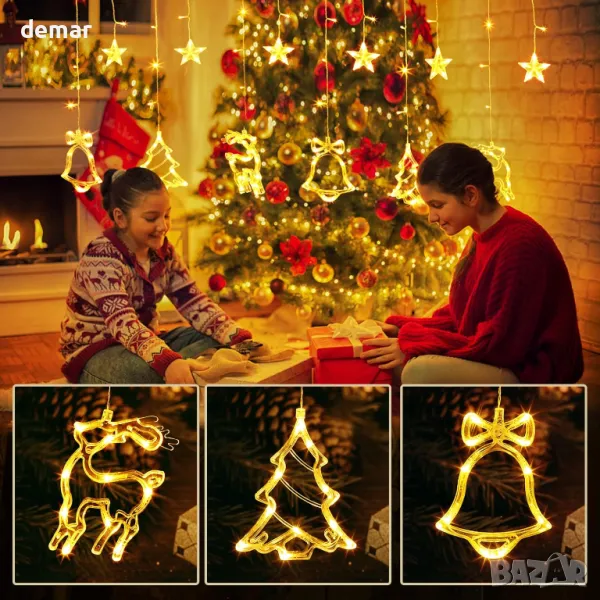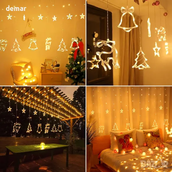 Този комплект приказни светлини за завеси с ширина 2,3 м включва 6 висулки със звезди, 2 коледни елхи, 2 елена, 2 камбанки и 138 светодиода с топла бяла светлина за уютна, празнична атмосфера. Дължините на окачването са 70+20см и 45+9см. Светлините предлагат 8 режима на мигане с функция за памет, което гарантира, че настройките остават дори след прекъсване на захранването. Безопасни на допир с ниско напрежение и CE сертификат, светодиодите остават хладни за продължителна употреба, което ги прави подходящи за деца и домашни любимци. Водоустойчиви по стандарт IP44, те са идеални както за вътрешна, така и за външна декорация, но изискват защита за неводоустойчивата захранваща линия и контролера. Перфектни за различни поводи, включително сватби, празници и партита, тези светлини осигуряват гъвкаво 360-градусово осветление, което подобрява всяко пространство.