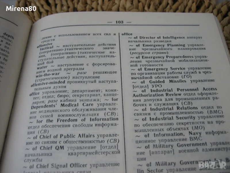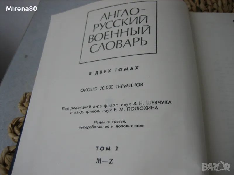 Луксозно издание, отлично състояние. Изд. Военное издательство - Моска, 1987 г. Твърди корици, 688 стр. Съдържа около 70 000 термини от военната област. Трето, допълнено издание.
