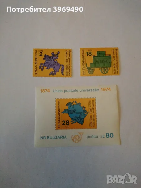 Серия от 2 пощенски марки плюс голяма марка блок от България 1974 г.100 години всемирен пощенски съюз.
