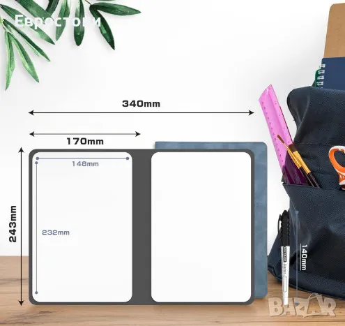 Лека и преносима. Бялата дъска има преносим дизайн за чанта. Всяка страна има приблизително размер на лист DIN A5 и е сгъната с размер приблизително 24 x 34 cm. Тежи само 160 грама. Много е удобна за всекидневно носене!