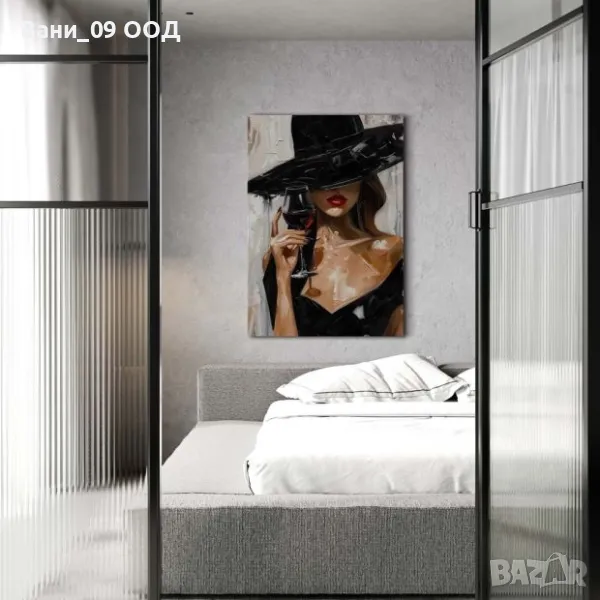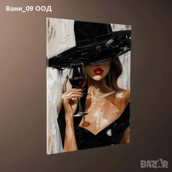 Ефектна картина-канава, изобразяваща жена, облечена в черно, държаща чаша червено вино.