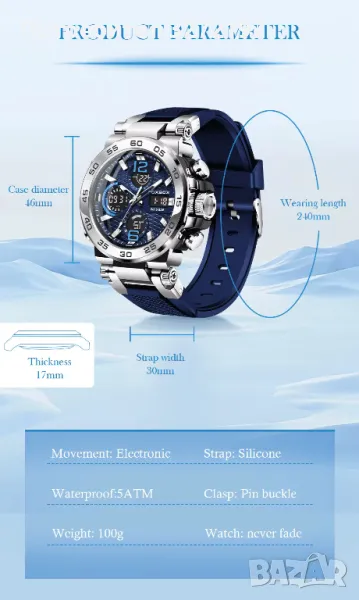 Двойна часова зона, календарен ден и дата, аларма, водоустойчив, LED