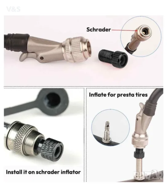 Комплект адаптери за вентили за велосипеди: 4 x клапани (вложки) + 4 x защитни капачки за клапани + 4 x гайки за джанти + 2 x адаптери + 1 x адаптер за кола + 2 x защитни капачки + 1 x ключ за клапан. Идеален като резервни части, резервни комплекти и ремонти. ИЗДЪЛЖИТЕЛЕН МАТЕРИАЛ - Изработени от висококачествени материали, тези адаптери за велосипедни вентили са издръжливи и устойчиви на корозия за безопасна и надеждна дългосрочна употреба. Френският велосипеден вентил има много добра херметичност, може да спре изтичането на стария клапан и да направи гумите на велосипеда здрави. Готов за употреба - Комплектът адаптер за вентил заема малко място и се доставя с много преносима кутия за съхранение, а теглото му няма да ви натежи. Всички части са подготвени за пътуване и спешни случаи. ЛЕСЕН ЗА ИЗПОЛЗВАНЕ - С този адаптер за вентил можете лесно да смените велосипеда си с адаптер за клапан. Просто стиснете адаптера, за да напомпате гумите си или да проверите налягането в гумите. Можете да оставите адаптера на щангата на гумата, за да напомпате гумата по всяко време и това работи с почти повечето гуми за велосипеди. ШИРОКА УПОТРЕБА: Адаптерът за велосипеден клапан пасва на всички велосипеди, оборудвани с френски клапани. Ако имате нужда от американска помпа за помпане на гумите, можете да монтирате адаптора на клапана и да го използвате безпроблемно. Този комплект за смяна на вентили за велосипеди е идеален като резервен ремонтен комплект и не трябва да липсва от който и да е комплект за повреда.