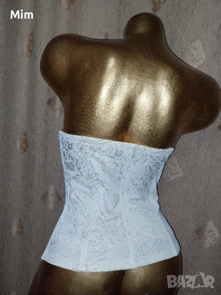 Сатенен корсет с 7 отвесни банели, закопчаването е отпред с телени закопчалки по цялата дължина 28 см широчина от 75 до 100 см еластичност. Нов без хартиен носител ,без забележки.