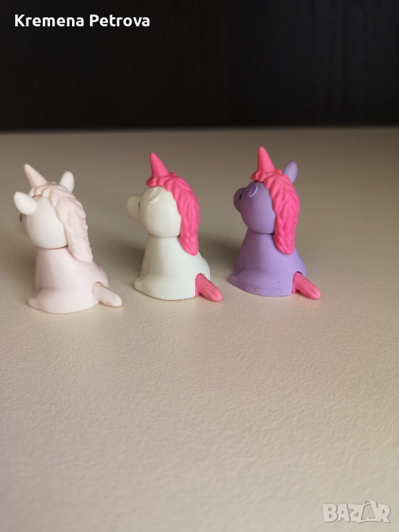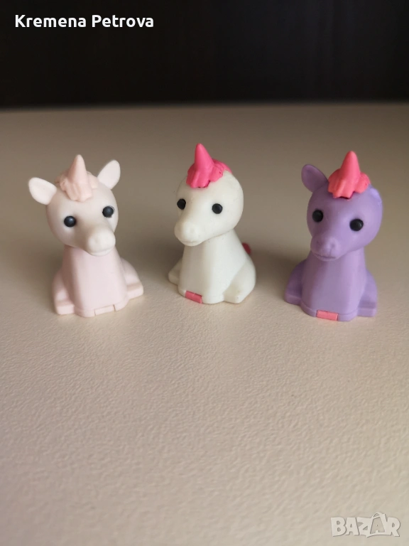 Снимка 13-15: комплект фигурки на еднорози, които могат да се разглобяват. Имат следи от употреба - на едното липсва едното ухо, на второто си има всичко, на третото му липсват двете уши, Обща Цена 1,00€