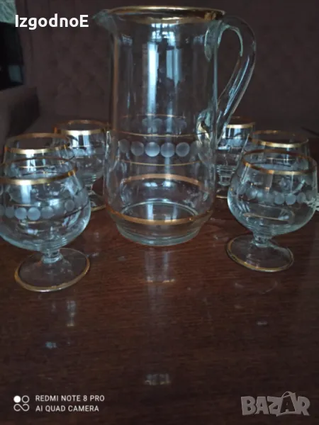 Стар стъклен сервиз за вино - чаши с кана със златен кант → Обява 48173242