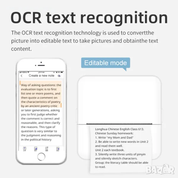 Мини машина за термичен принтер за стикери Inkless Portable Thermal Printer BT Wireless Portable Phone Printer Sticky Note Printer for Notes Съвместим с iOS/Android Бял Осигурете функция за термичен печат, комбинирана с масивна банка с въпроси, за да ви помогне лесно да научите и прегледате грешни въпроси. С технологията за разпознаване на текст OCR, той може да конвертира изображения в редактируем текст, което ви улеснява да правите снимки и да получавате текстово съдържание. С технологията на печатащата глава за фото качество, принтерът произвежда високо ясни снимки, което прави спомените ви по-живи. Можете лесно да отпечатате и залепите препоръчани стикери само с едно щракване, проста и бърза работа. Безжична връзка, проста работа, няма нужда от сложна линия, печат по всяко време и навсякъде. Посрещнете различните си нужди за печат в офиса, като например печат на документи, лесно изпълнение на задачи за печат в офиса и учебната стая.