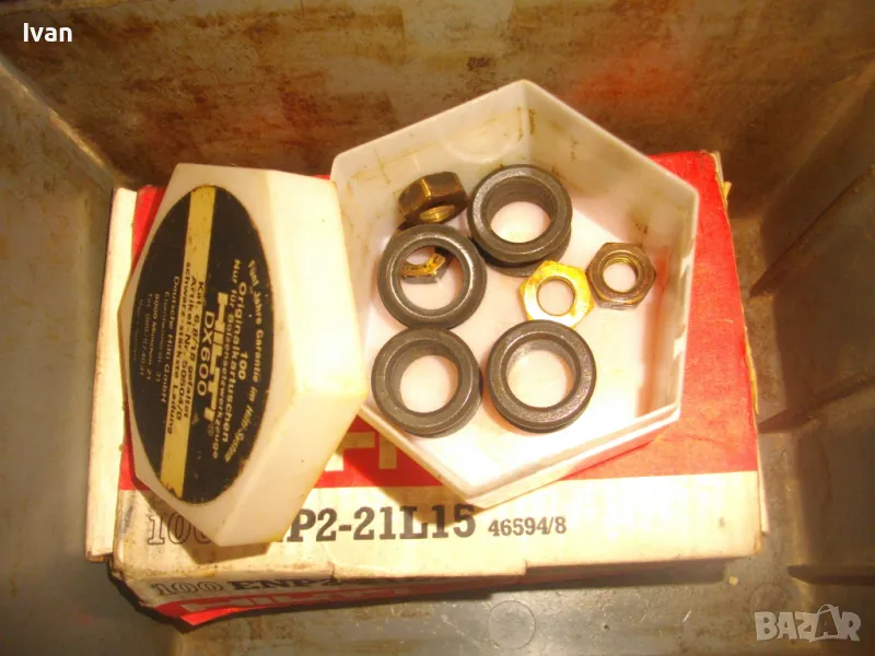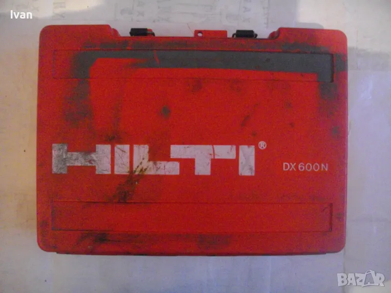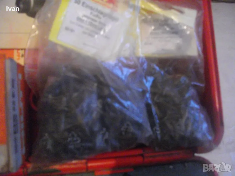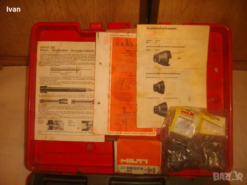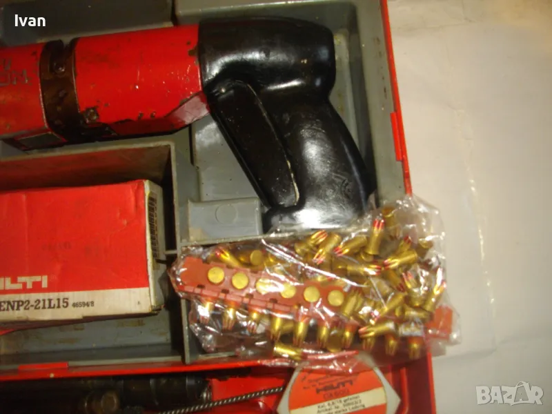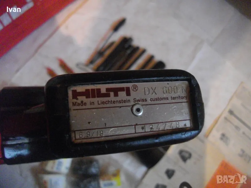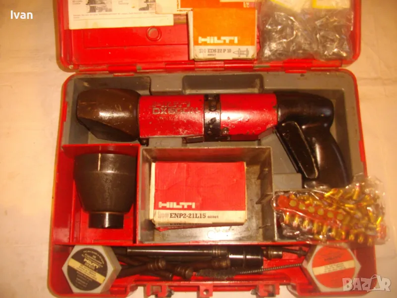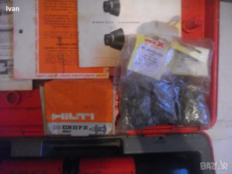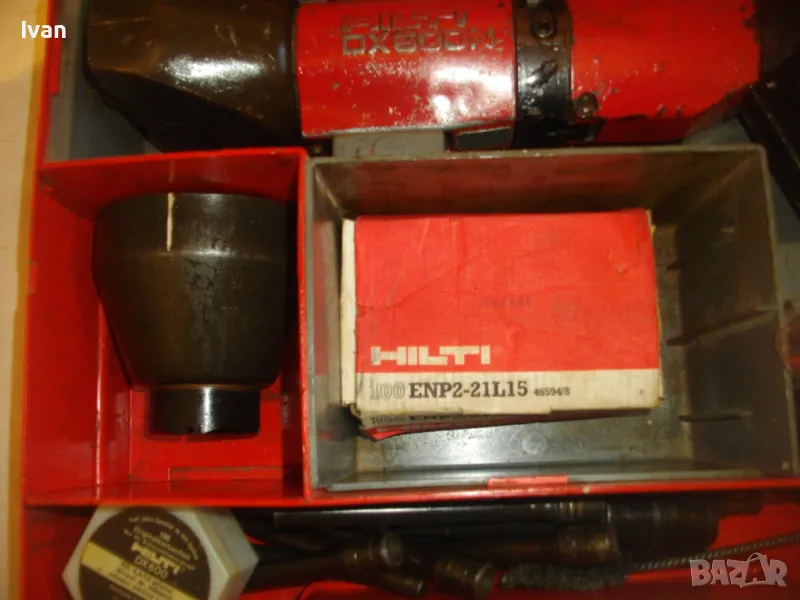 Комплект Хилти за бърз директен монтаж в бетон, желязо и метални конструкциии чрез капсов заряд - оригинален Лихтенщайн. Марка и модел на комплекта - HILTI DX 600 N. Made in Liechtenstein customs Teritory. Калибър за капсите 6,8/18. Комплектът включва: ръчен уред за бърз монтаж HILTI DX 600 N в отлично работно състояние. Без никакви забележки. Различни бутала резервни общо 11 броя от закалена инструментала стомана, шомпол за почистване телена четка метална, кутия от капси с резервни части 4 бр. ограничителни пръстени за буталата и 4 бр. гайки затяжни за тях, кутия оригинална HILTI DX 600, пълна с червени капси, торбичка с 2 бр. капси на ленти и обикновени червени капси 6,8 калибър за модела, резервна втора чашка отпред стабилизираща плоча за главата на Хилтито, кутия оригинални стоманени пирони HILTI ENP2-21L15 Made in Leichtenstein - дължина на пироните 25 мм с работна дължина за забиване 21 мм, с 2 метални шайби на тях и лаго на марката маркировка на гливичките им. Втора кутия алиминиеви пирони с пластмасова шайба модел HILTI EDS 22 P 10 - оригинални Made in Leichtenstein с дължина 24 мм и работна дължина на забиване 22 мм. Отделно 3 пликчета пирони за желязо и бетон - немски, нови, марка FIXX DiY-Tech, размер 18 х 4 мм. по 50 бр. пирони в пликче масивни от закалена инструментална стомана. В комплекта са ключени книжки с техн. документация и оригинален на марката куфар с лого от твърда пластмаса. Комплектът е ползван, но е в пълна отлична работна изправност. Цена на всичко 599 лв. Цена на отделни комплоненти - по договаряне. Тегло на комплекта - 10,5 кг.