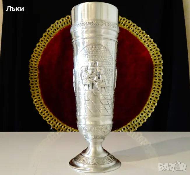 18.5 см.,диаметър 6 см.,тегло 360 гр.Вместимост 280 мл.Незабравим подарък за сватба,годишнина,калаена