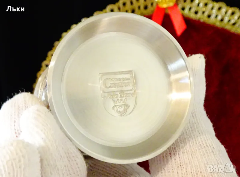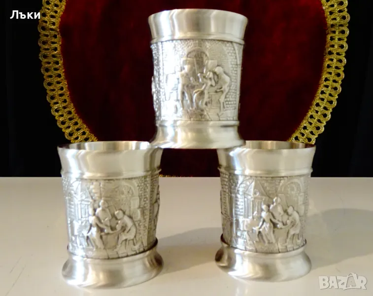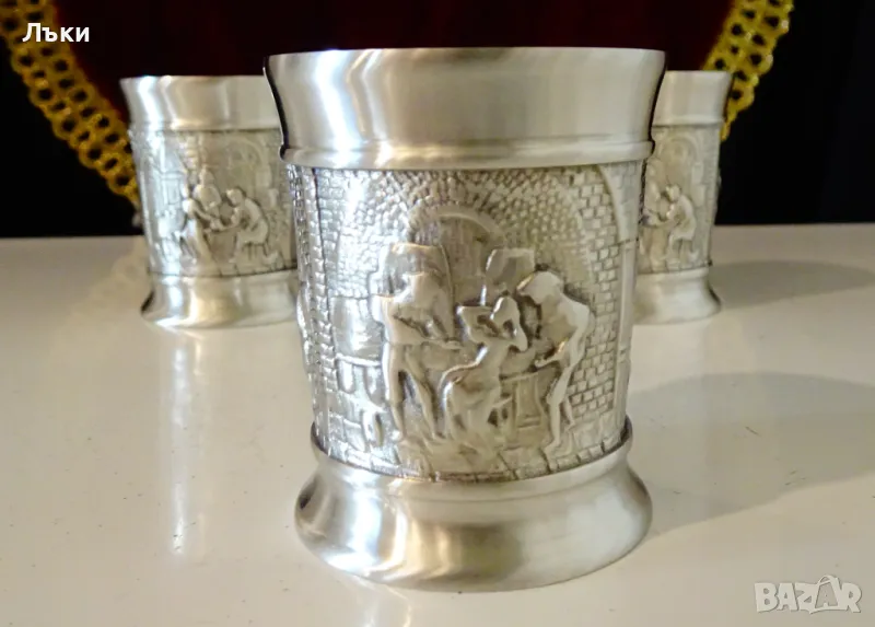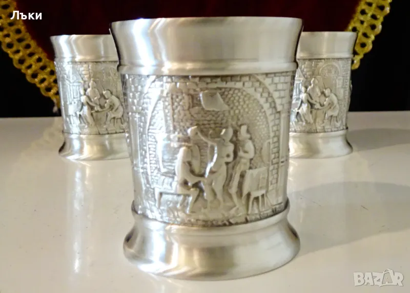 изработка от 95% калай и 5% сребро,маркирани от производителя.Предназначени за сватба,годишнина,калаена сватба,чашите са декорирани с три релефни картини на