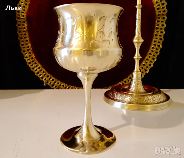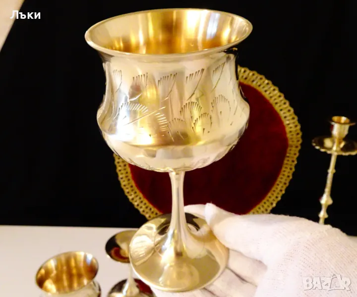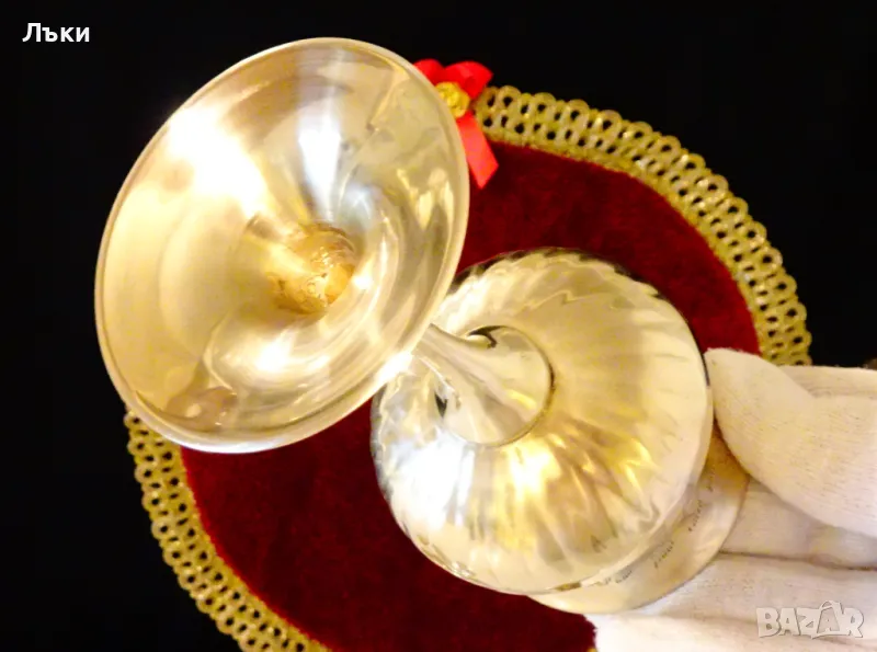 вино,шампанско,майсторска ръчна изработка от масивен високо качествен бронз – блести повече от златен.Има уникално ефектен дизайн,декориран с релефно гравирани орнаменти и вълшебен звън.Височина 13 см.,диаметър 7 см.,тегло 200