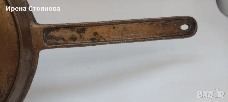 Винтидж, декоративен тиган с медно покритие. Дължина с дръжка 47 см и диаметър 23 см. На места, леки забележки по покритието. Цена 40 лв.