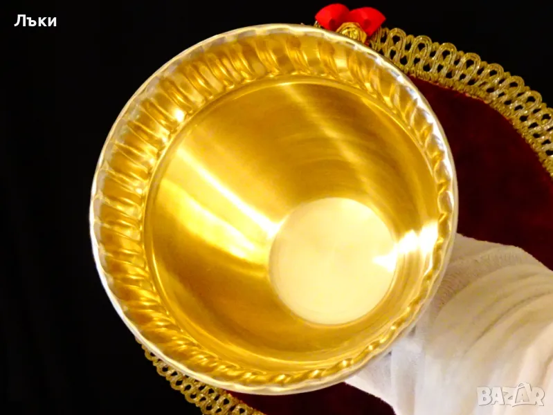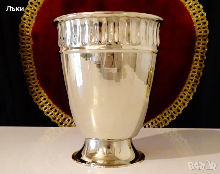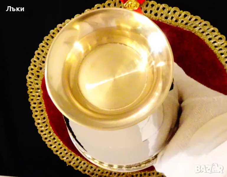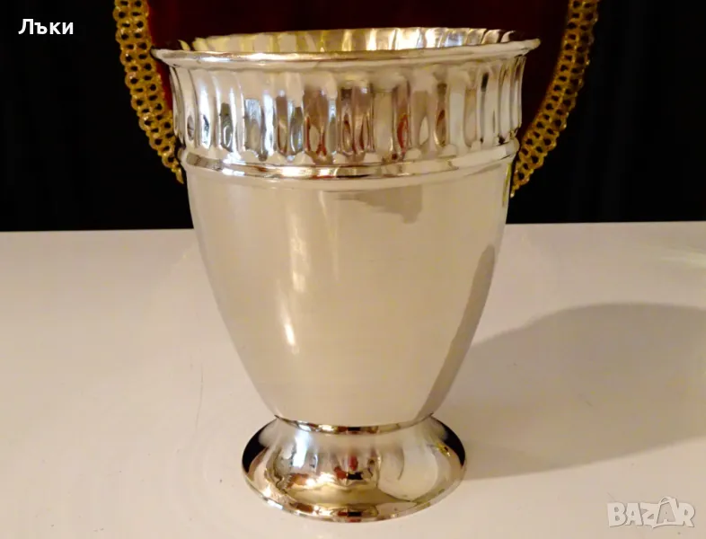 кован релеф.От вън е истинско огледало,от вътре е позлатен.Височина 14.5 см.,диаметър 11.5 см.,тегло 270 гр.Вместимост 800 мл.