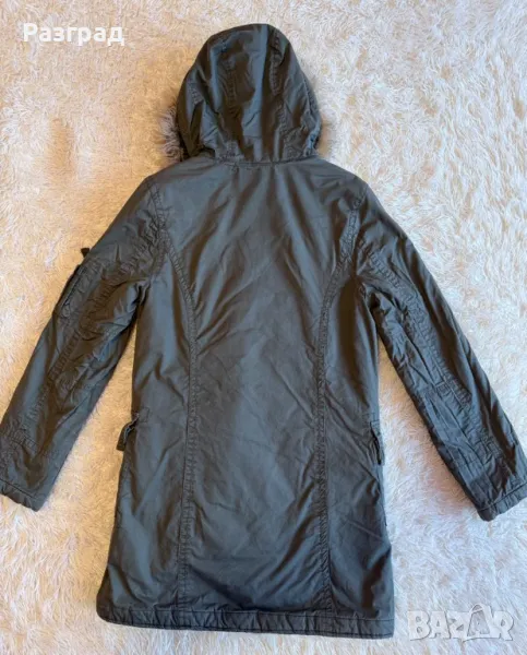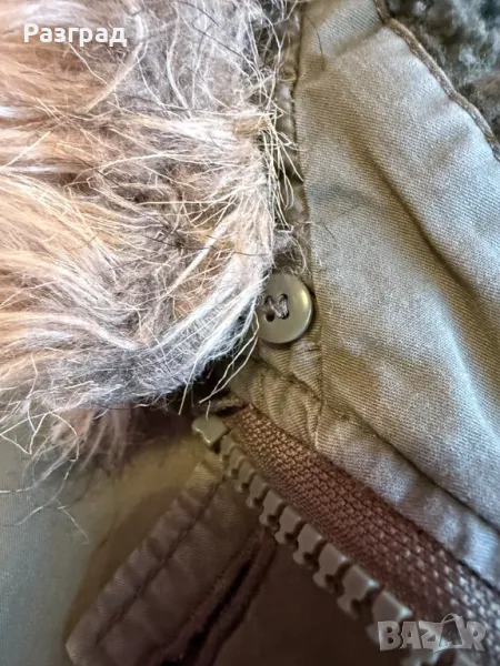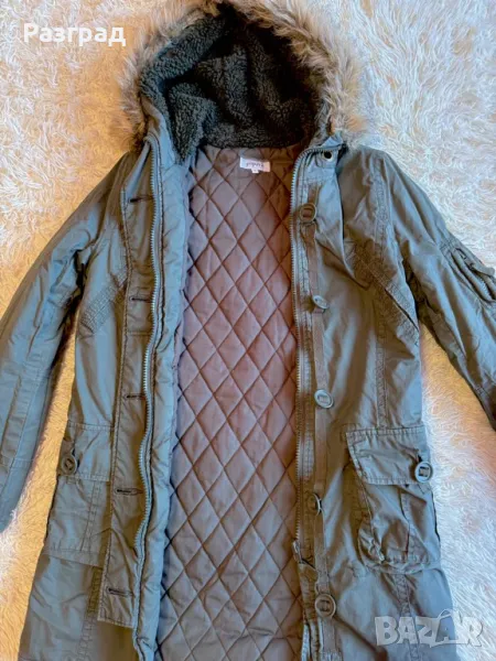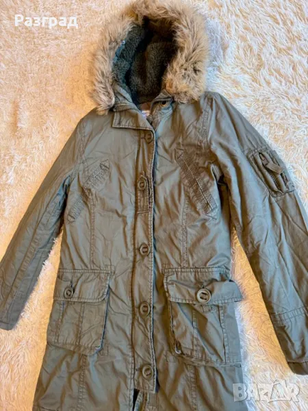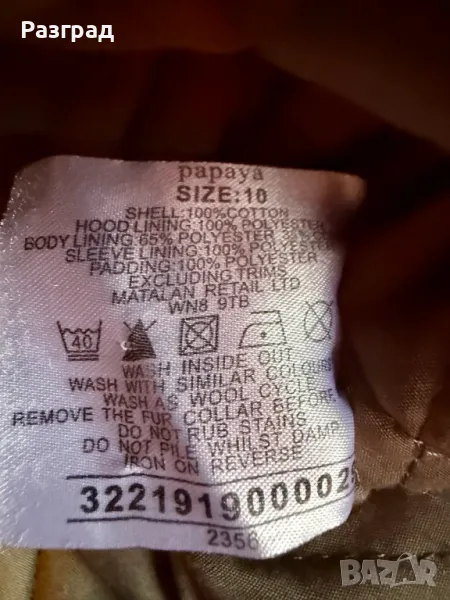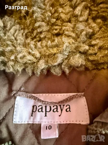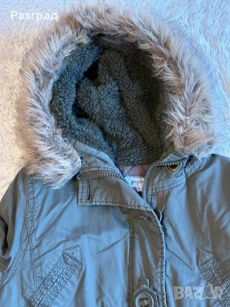 Произведено в Англия . Марка Papaya . Външен материал: 100% памук подплата: полиестер 100%. Двойно закопчаване -с цип и копчета. Два големи и удобни външни джоба. Пухестата част на качулката може да се маха посредством копчета. Използвано , без конкретни забележки , в добро състояние. Размери : дължина -85см., дължина на ръкавите -62см., ширина в раменете- 42см.( едностранно ) ,ширина подмишници -50см. едностранно.
