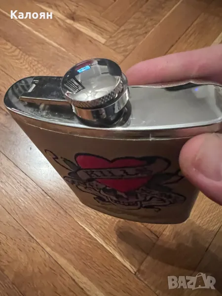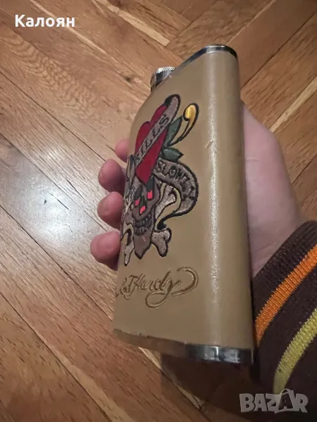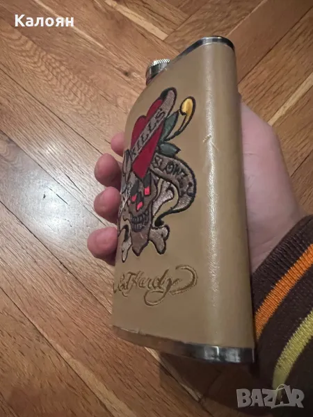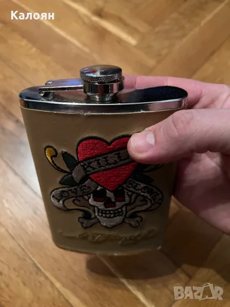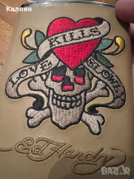 Манерка Ed Hardy, Stainless Steel 8oz, облицована с кожа и бродерия на винтидж татуировка