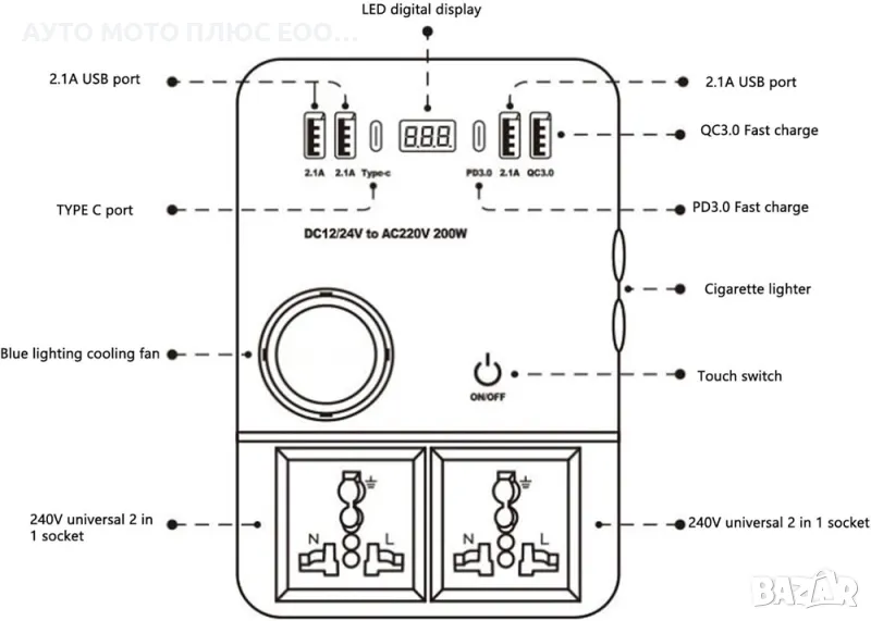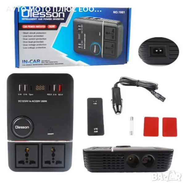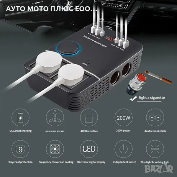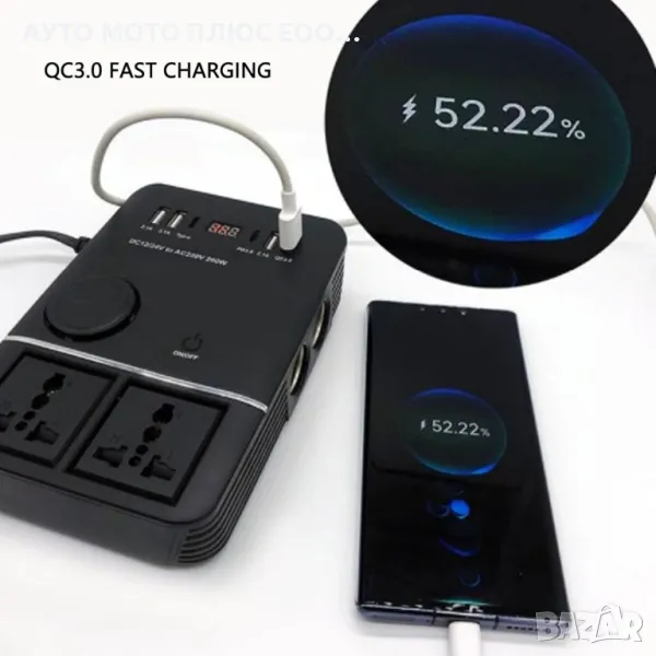 Автомобилен инвертор с две универсални гнезда, 4 USB и 2 C-TYPE порта.