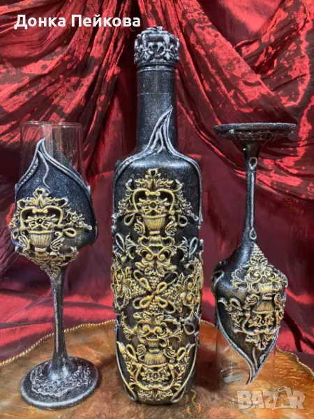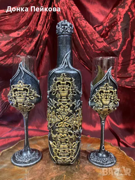 с имитация на старо злато и сребро - един впечатляващ подарък за годишнина, за Рожден Ден, за абитуриентска, за сватба, за годишнина, подарък с който гарантирано ще впечатлите всички! Комплекта е единствен и няма да има друг такъв, което го прави уникален. Съдържа бутилка за любимо питие, която не съдържа алкохол + 2 чаши. За изработката са използвани безвредни и водустойчиви материали. Може да се мие с мека гъбичка и без накисване. Да не се мие в съдомиялна машина и да не се мие с гореща вода.