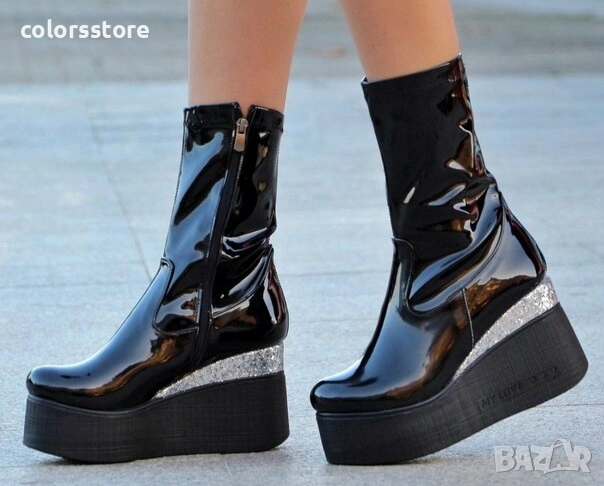 Боти на платформа - черен лак с бронз брокат и черно ходило - 121K