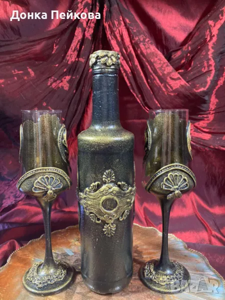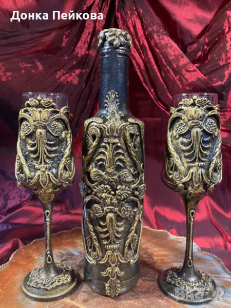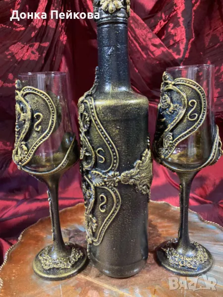 с имитация на старо злато и сребро - един впечатляващ подарък за годишнина, за Рожден Ден, за абитуриентска, за сватба, за годишнина, подарък с който гарантирано ще впечатлите всички! Комплекта е единствен и няма да има друг такъв, което го прави уникален. Съдържа бутилка за любимо питие, която не съдържа алкохол + 2 чаши. За изработката са използвани безвредни и водустойчиви материали. Може да се мие с мека гъбичка и без накисване. Да не се мие в съдомиялна машина и да не се мие с гореща вода.
