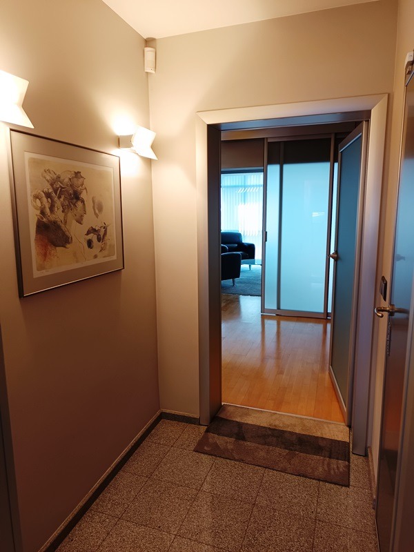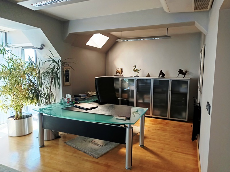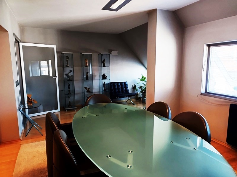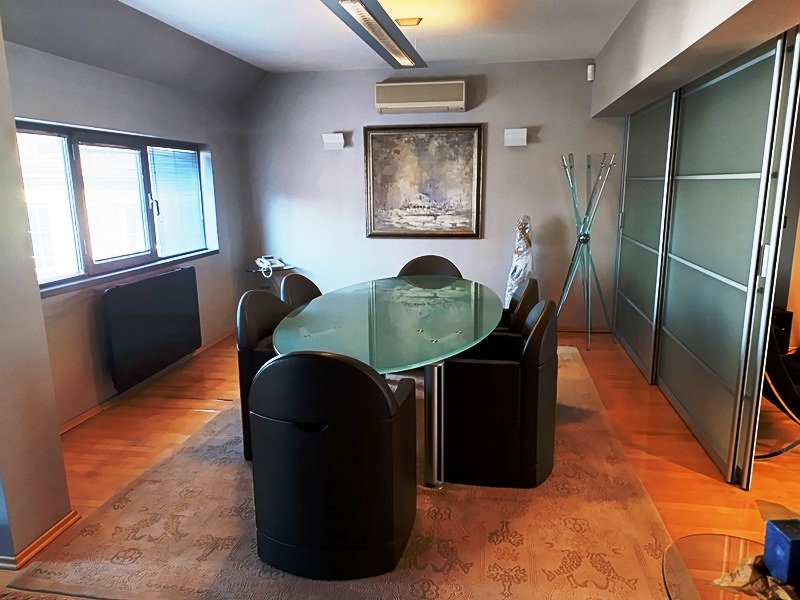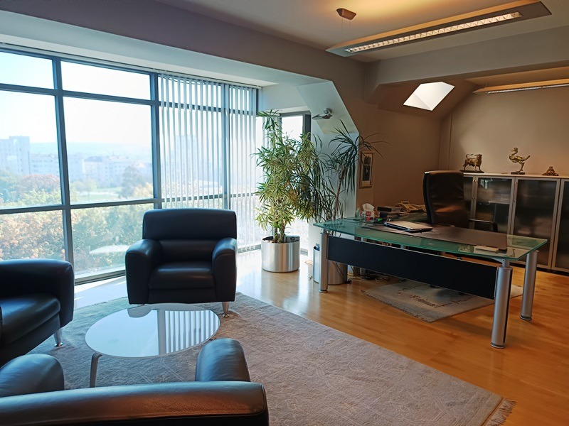 Луксозен апартамент с предназначение за офис в сграда с лице на бул.Витоша и въведена в експлоатация през 2002год. Чистата площ е 104,70кв.м и също така 9,25кв.м. ид.ч.от парцела, върху който е построена сградата. Имотът е напълно завършен с луксозни материали и поръчково обзавеждане, техника, както е видно от фотосите. Разпределение: входно антре, салон със секретарски кът, кухня, обширен кабинет с приемна,две заседателни зали, санитарен възел. Навсякъде настилките са от естествени материали,стените с интериорни мазилки,вградено осветление, луксозни вътрешни интериорни врати; система за отопление и вентилация на ток; напълно обзаведена и оборудвана кухня; СОТ с видео наблюдение. Предлага се във вида, в който е, без личните вещи. Много важно е, че въпреки статута на имота се ползва ток на битова тарифа, не е промишлена! Имотът може лесно да бъде преустроен за живеене. Сградата е съвременна,в идеалния център на София,с луксазни общи части, обслужва се от луксозен асансьор, има ограничен достъп, а в близост може да се ползва охраняем паркинг. Огледи с ключ на 0899859645 и 0884176139 З.Астаджова