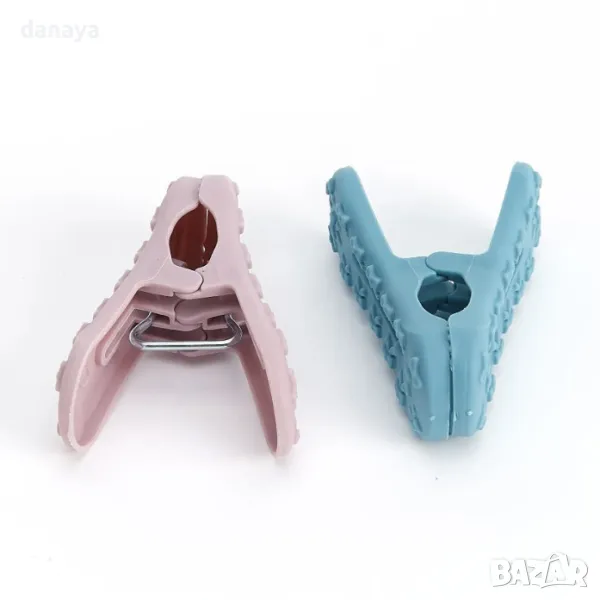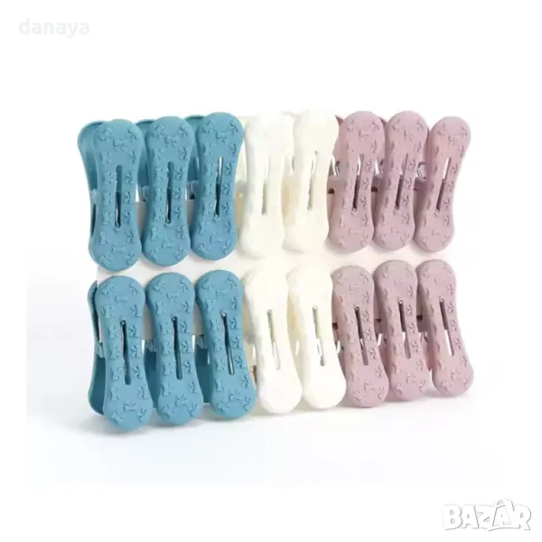 Щипки за простиране в бял, син и лилав цвят, комплект от 16 броя. Щипките са декорирани с множество малки панделки. Здрава конструкция, удобни за хващане, издържливи. Щипки с широко у многофункционално приложение – може да се използват като щипки за закрепване на торбички със зърнени храни, чипс и др., както и за всякакви домашни и гаражни цели. Перфектни са за окачване на снимки, занаятчийски проекти и др. Супер удобни за използване.