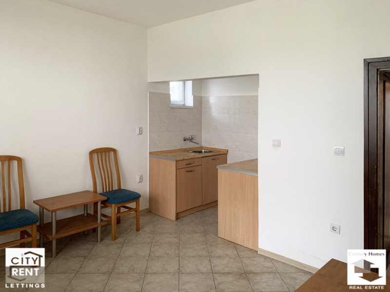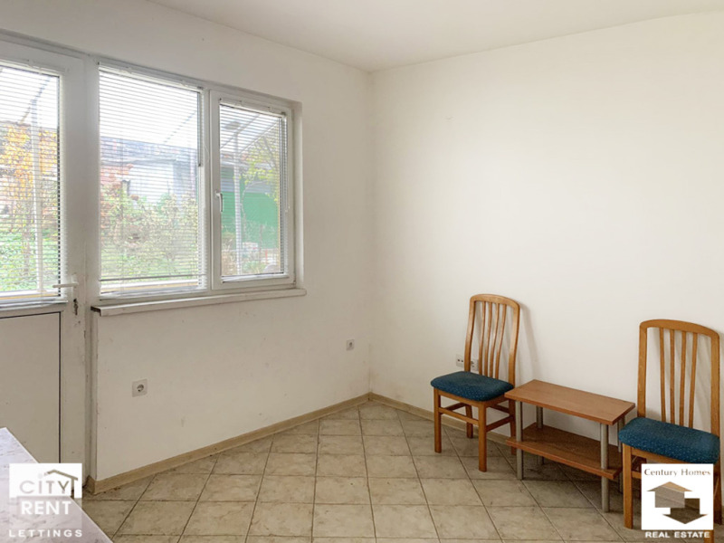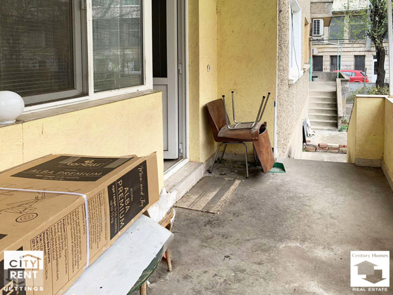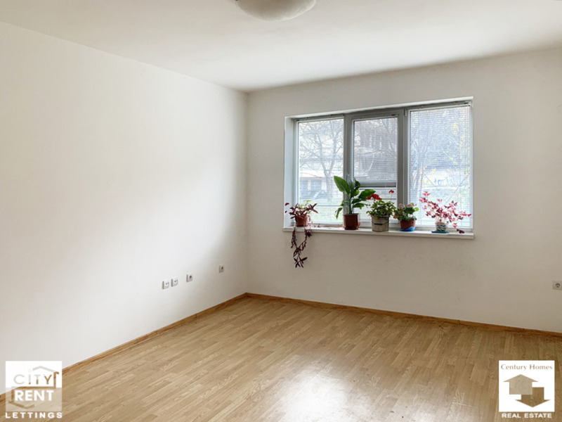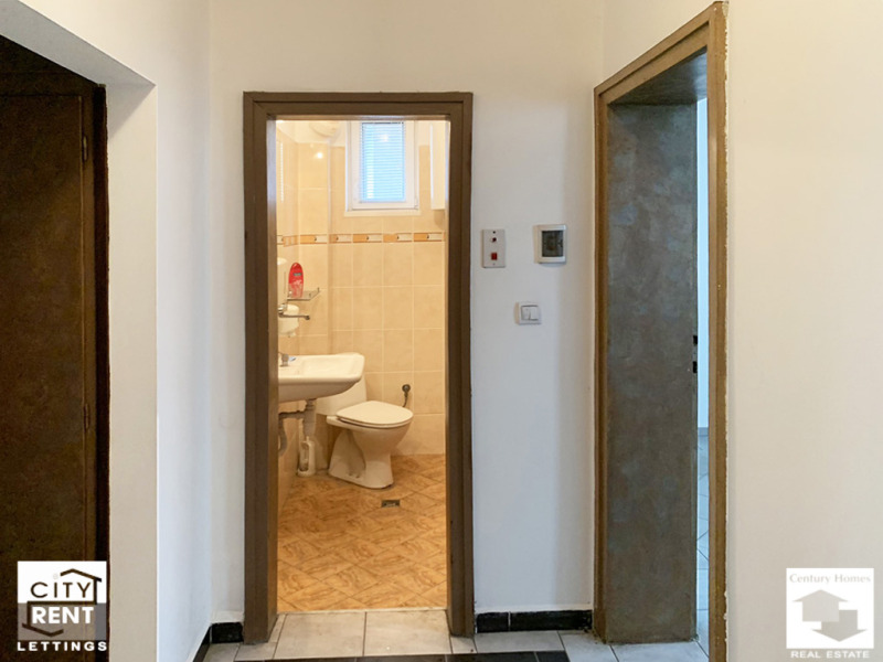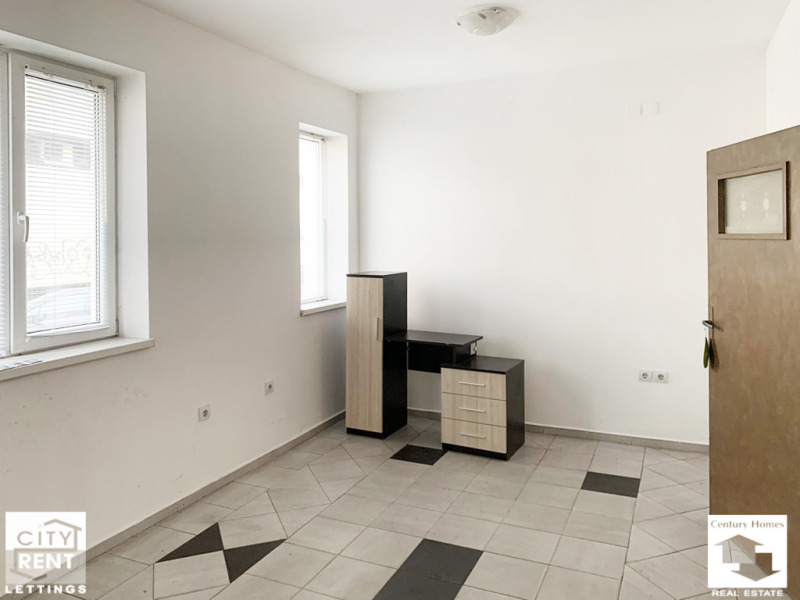 Разположен на партерен етаж, офисът е с площ 80 кв. м., разпределени в приемна зала, коридор, баня с тоалетна и две стаи, в една от които има обособен кухненски бокс и излаз към тераса, с подход към двор. Имотът се отдава необзаведен, с PVC дограма, стени с латексно покририе и подова настилка теракот. В наемната цена е включено и едно паркомясто.