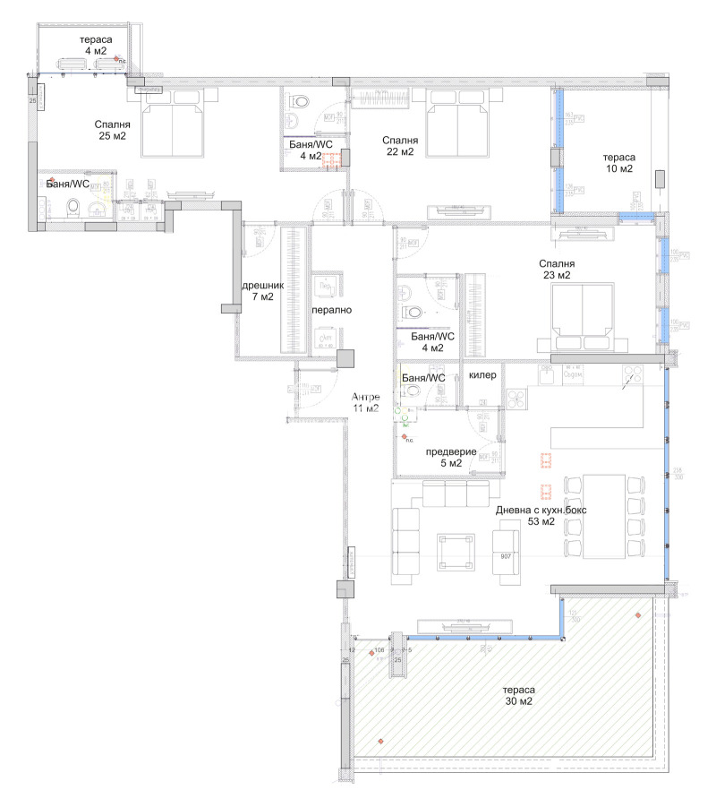 Локация: Бърз достъп както до Центъра, така и към изходите на града. Множество комуникации, в близост до реновирания бул. Марица с площадки и паркова зона по него. Разположение: Жилището, което Ви предлагаме е с ПРОСТОРНА, ЪГЛОВА дневна с площ от 53 кв.м. с излаз към прекрасна тераса- тип ЛЯТНА ГРАДИНА, три големи спални по 23 - 24кв.м, всяка със собствена баня и тоалетна, дрешник, перално помещение, килер, санитарен възел за гости, две тераси към спалните и голямо входно предверие. Светъл и просторен апартамент с ТРИ ИЗЛОЖЕНИЯ- ЮГ/ ИЗТОК/ СЕВЕР. Възможност за закупуване на подземен гараж на цена: 24 900 евро!!!