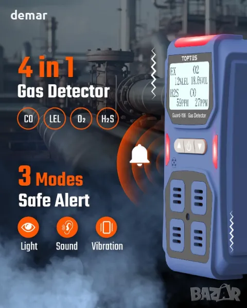 Газов детектор 4 в 1 TopTes Guard-156, за H2S, CO, LEL и O2, режими на тройна аларма