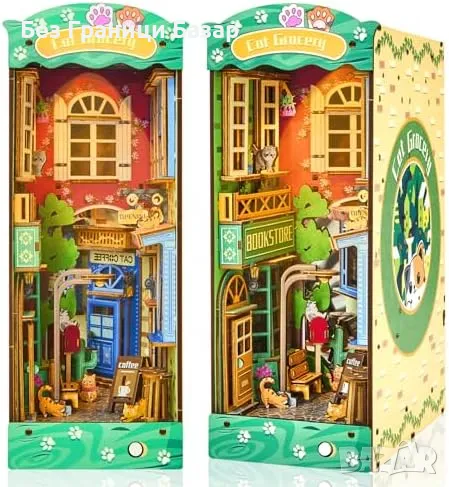 Уникален дизайн на улична сцена: Въздействаща декорация за книги с очарователни котки и уютна атмосфера.