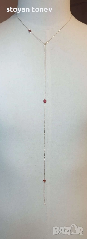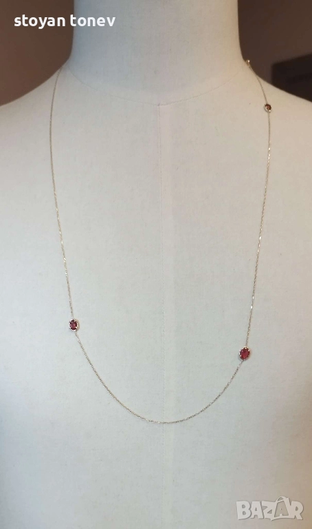 рубина, изработена от 14К злато по авторски проект - уникат. Дължината на верижката дава възможност за няколко начина на носене около шията, а с малко повече въображение се превръща в уникална гривна. Обкова на рубините позволява те да не губят красотата от всяка една страна. Нова, неползвана.