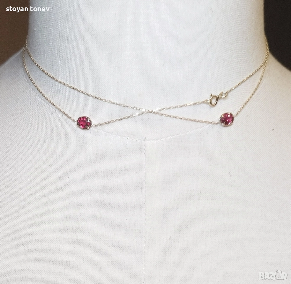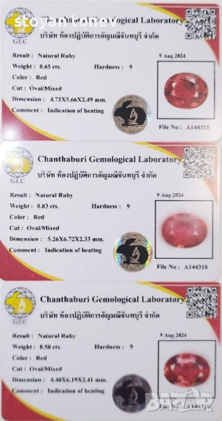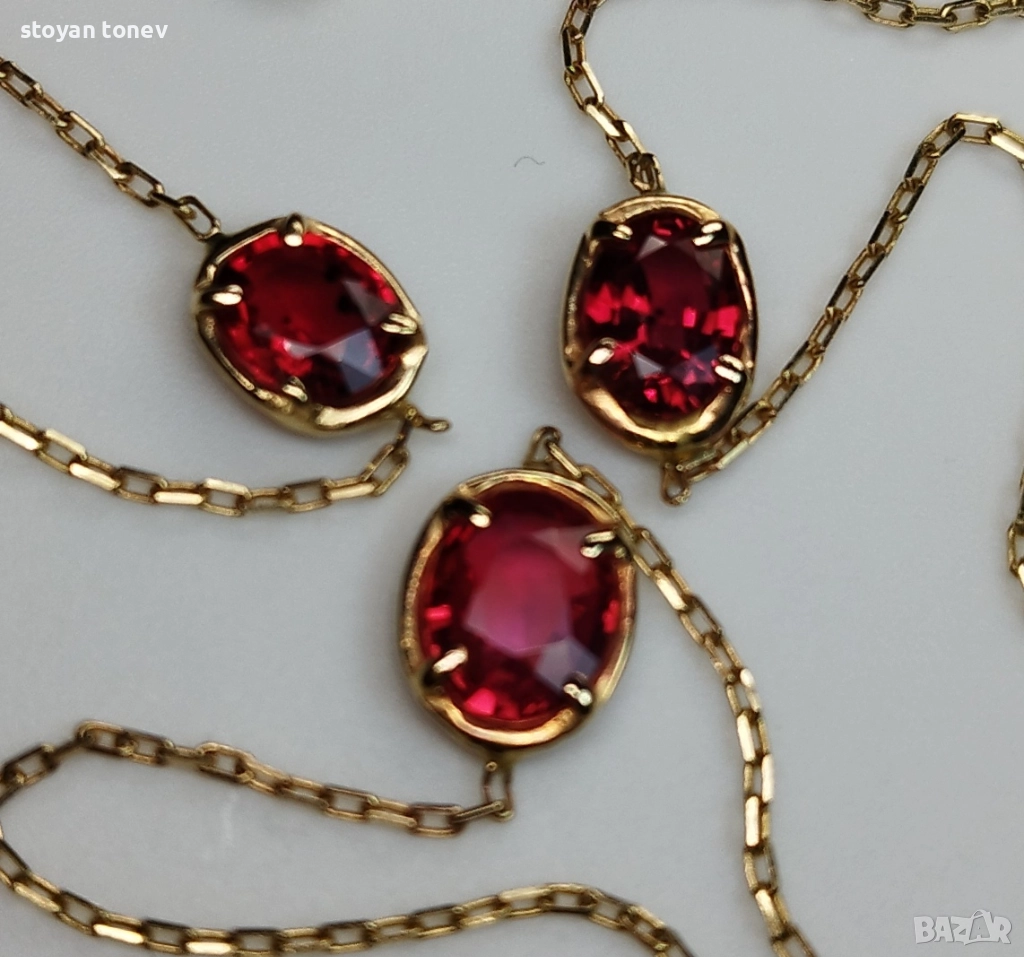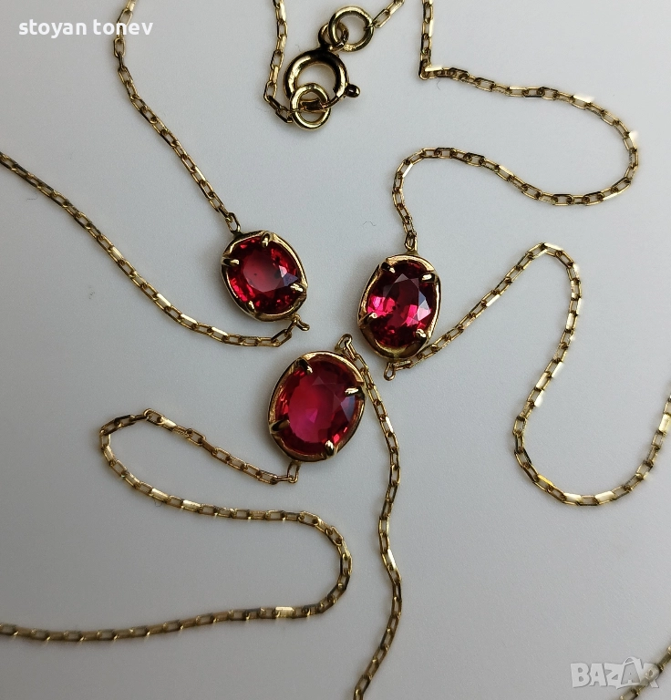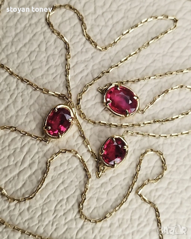 И трите рубина са със страхотен жив цвят и качество, притежават сертификати и са VS чистота. Общото им тегло е 2.06кт. Верижката е с тегло 3.23гр. с дължината 76см.