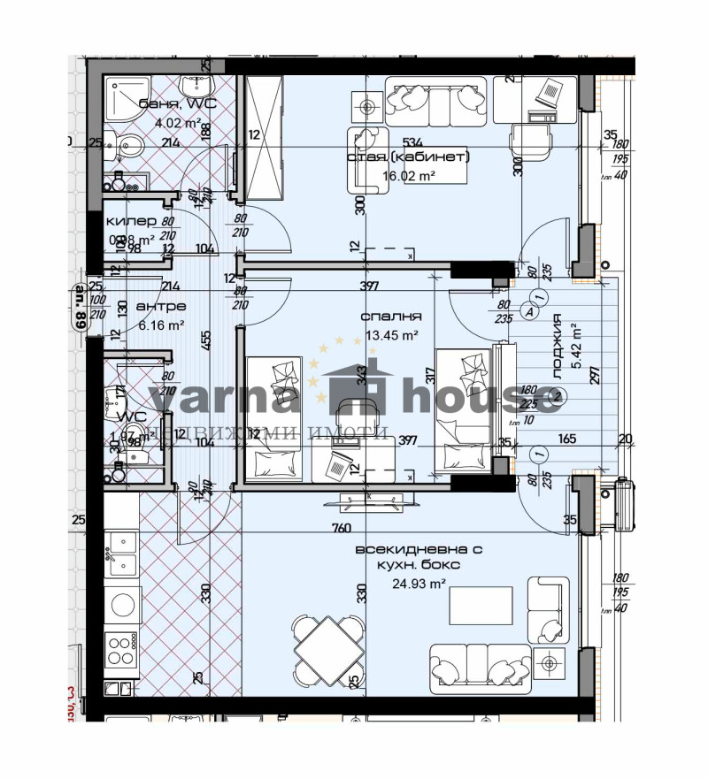 - Коридори, кухня и стаи подготвени за довършителни работи (циментова замазка, гипсова шпакловка).