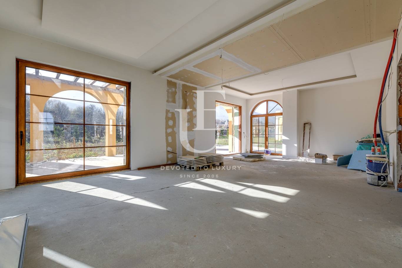 Разпределението на имота предлага изключителен комфорт и функционалност - голям хол с кухненски бокс и южна веранда, с възможност за зимна градина отстрани на къщата, три спални, пет бани и тераса на втори етаж с гледка към Витоша. Сутеренното ниво предоставя възможност за оформяне на спа зона, киносалон, фитнес, още две спални или каквото бъдещият собственик пожелае.